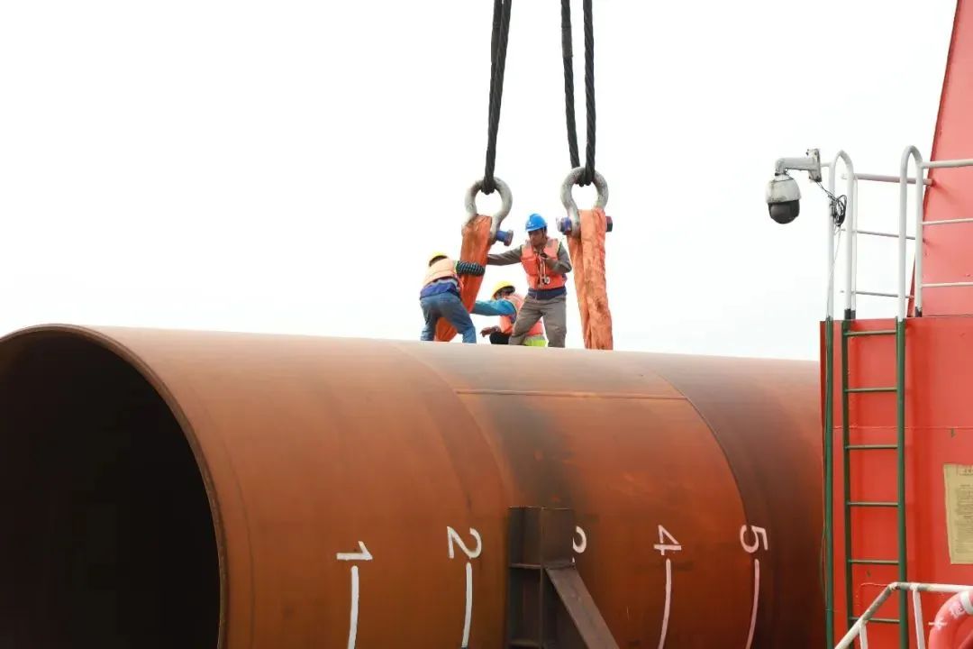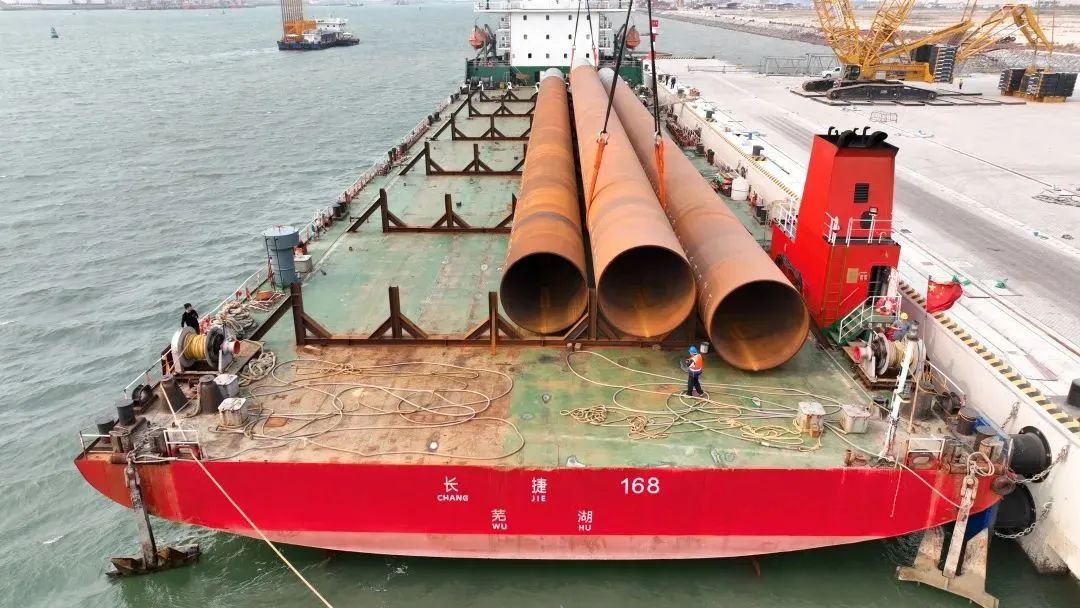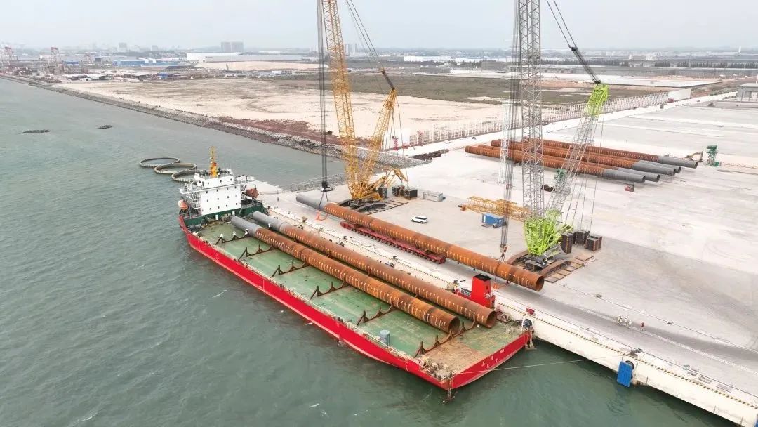 近日,“長捷168”輪安全靠泊北部灣港欽州碼頭大欖坪作業區,裝載8根/約5296立方米風電管樁,單件長90米,件重270噸,這標志著欽州港碼頭新增貨種——風電設備的裝船作業進入常態化。