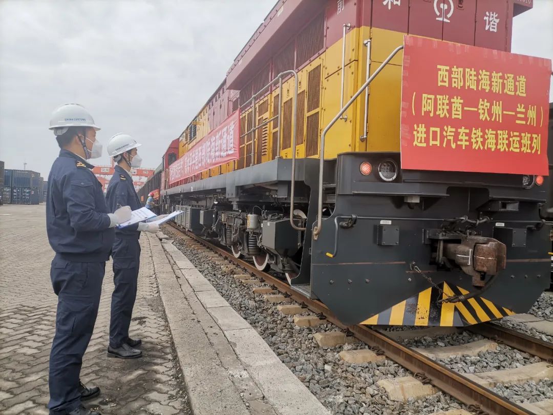 2017年9月25日,西部陸海新通道常態化運行班列在渝首發。作為西部陸海新通道的策源地和最早推動者之一,欽州港海關主動作為,服務西部陸海新通道快速發展。2016年欽州港海關最早推動重慶貨物借道欽保口岸海鐵聯運直達新加坡項目,制定高效通關保障方案,確保了2017年5月12日首列試運行班列成功開往欽州港東站,同時也為9月份班列的常態化開行奠定了堅實基礎。自此欽州港開啟了作為西部陸海新通道出海口的發展新篇章。